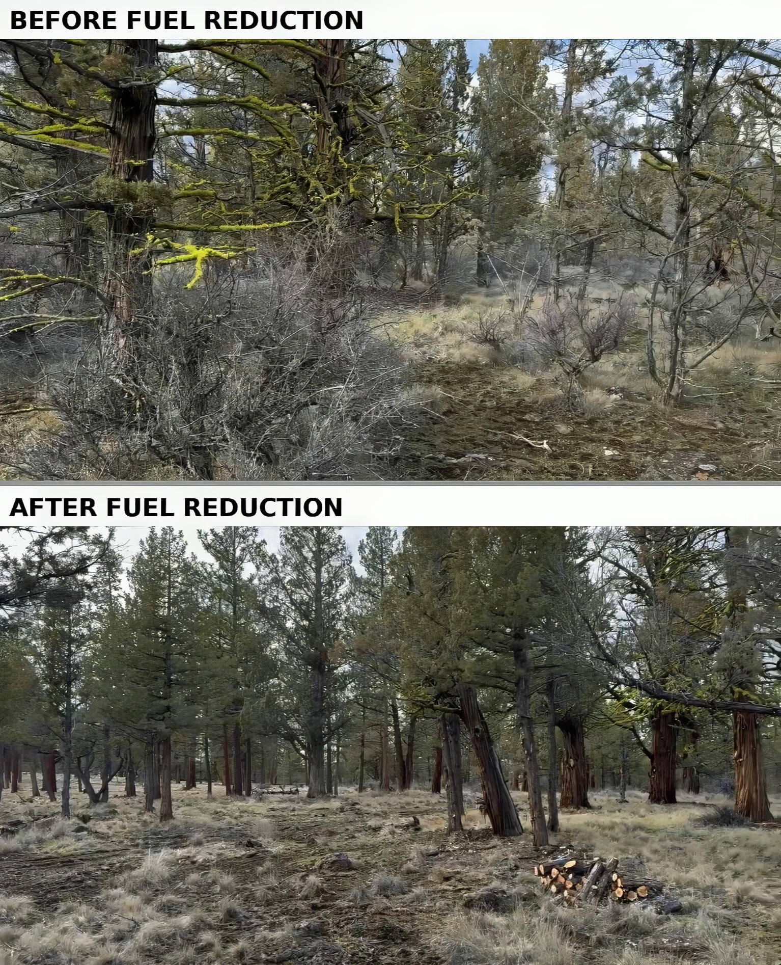 We organize homeowners, volunteer groups, state, county, and federal resources to support wildfire mitigation efforts in Whychus Canyon Estates. Ladder fuels spread fire fast. We are focused now on reducing ladder fuels through limbing up and removing trees and brush.We also drive education and awareness events and communications. If you want to volunteer your time or money, it could make a huge difference in remaining prepared for the next wildfire event. Use the "Contact Us" button to volunteer your time. Click here to contribute to our wildfire mitigation fund.We spend our donation and grant funds on contractors, rental equipment such as chippers, large dumpsters, fuel, and chainsaw repairs. We are a 501(c)(3) corporation, and your donations are tax-deductible.Your donation helps turn more ‘before’ areas into ‘after’ areas.